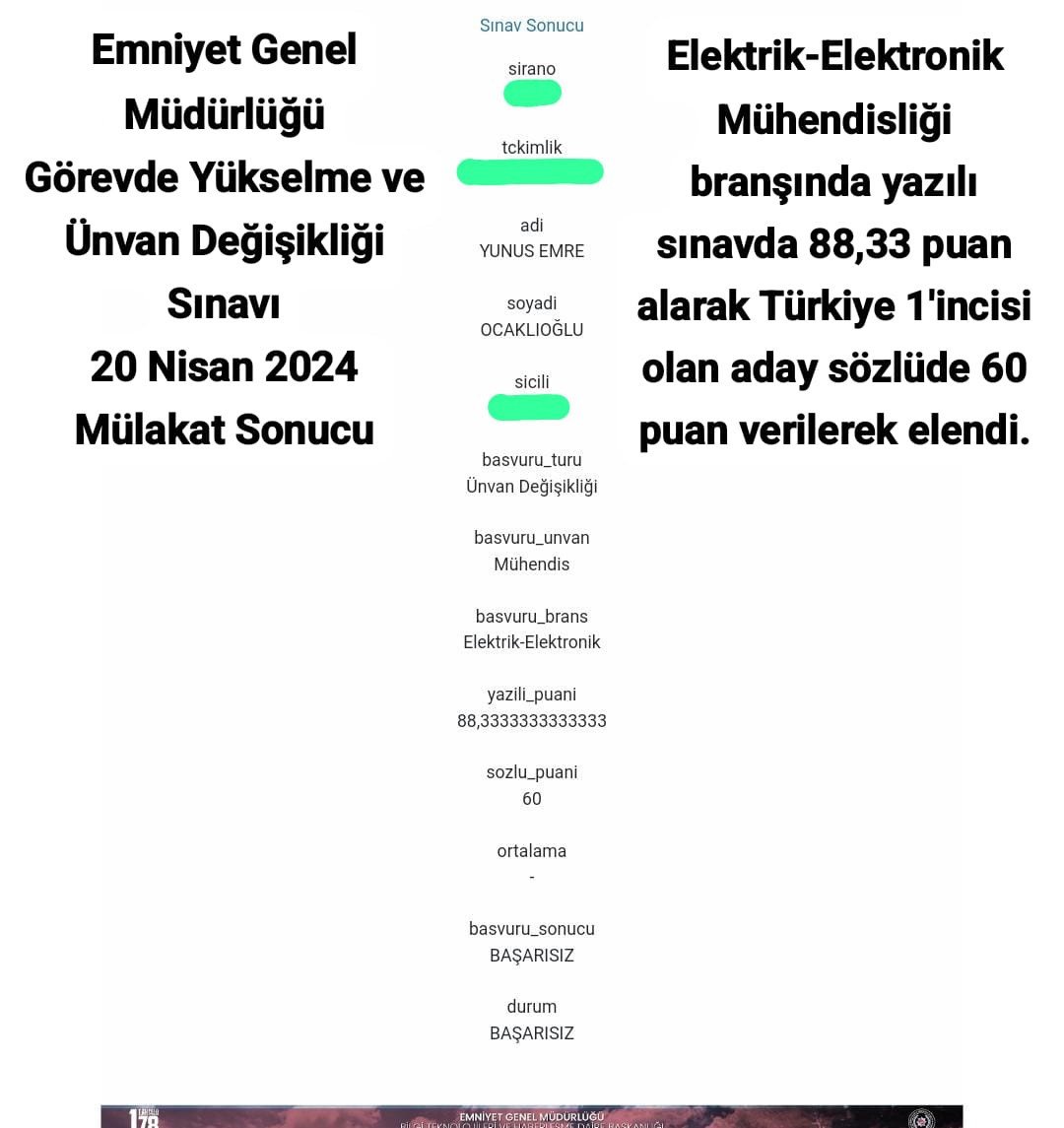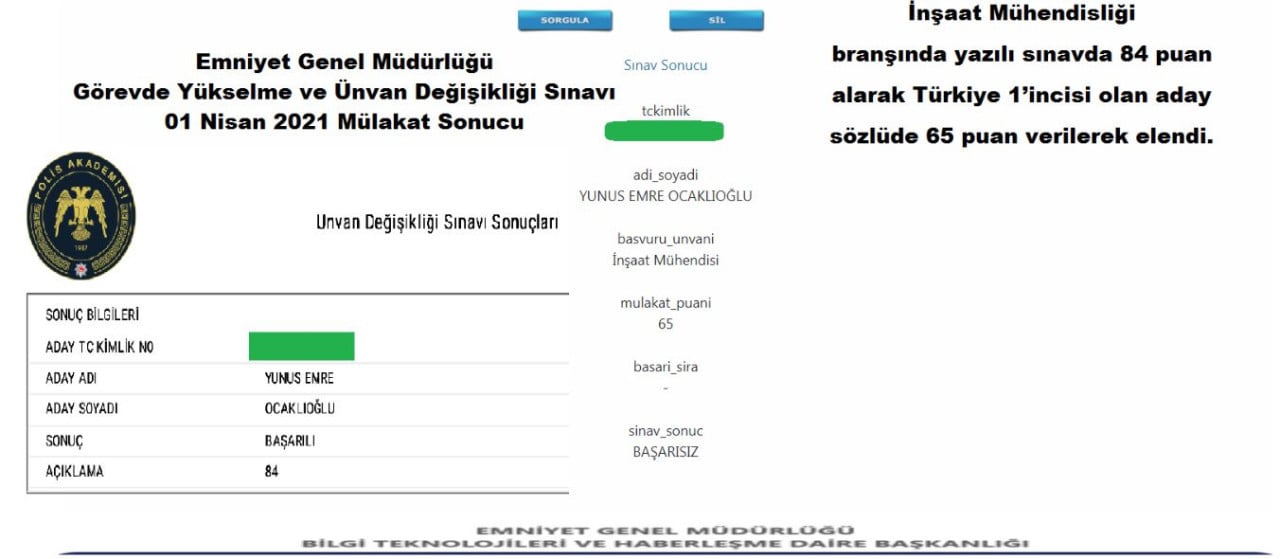 Yazılı sınavda yüksek puan almasına rağmen, hatta Türkiye birincisi olmasına rağmen mülakatta düşük puan verilerek elenen yüzlerce EGM personeli olduğu belirtildi. Gazete Duvar’ın haberine göre; Konu Meclis gündemine taşındı.